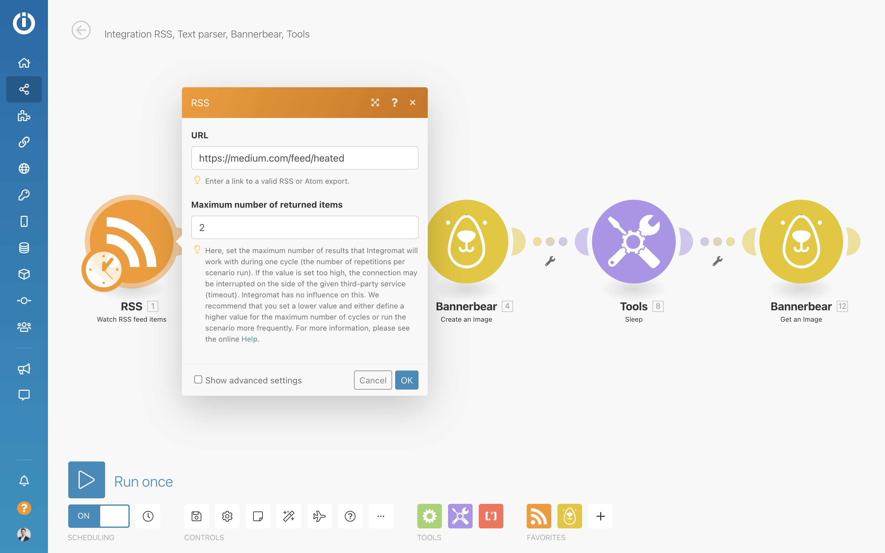 In this tutorial we will create an Integromat scenario that takes an RSS feed of news articles (featuring a title, image, author etc) and generates poster images like this: