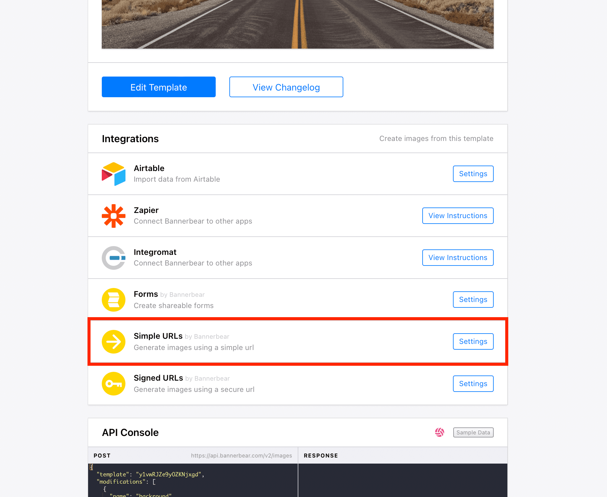 Scroll down on the Bannerbear template page and click the Simple URLs settings: