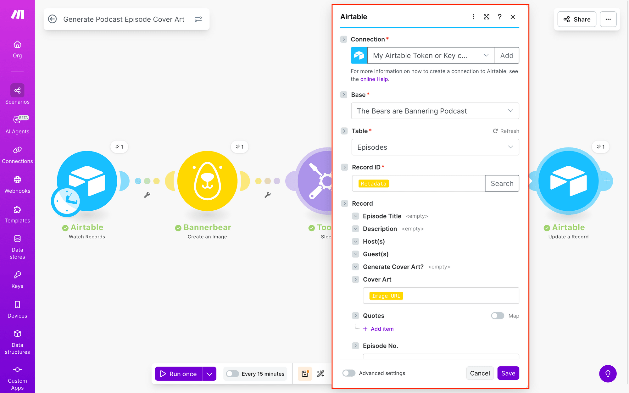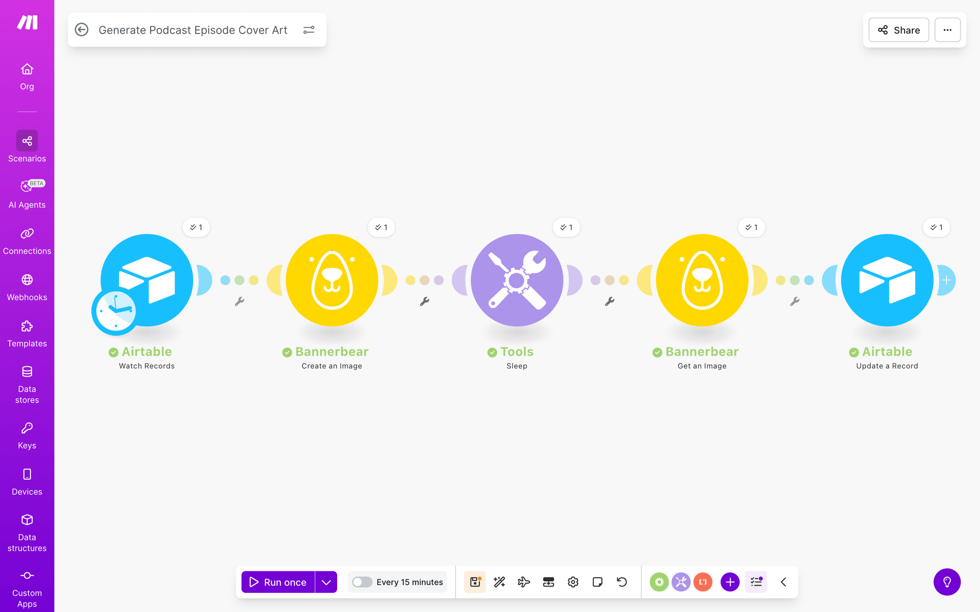 Once you’re happy with your scenario, select a frequency at which you’d like Make to check Airtable for changes. Toggle the scenario on. The entire scenario will look something like this: