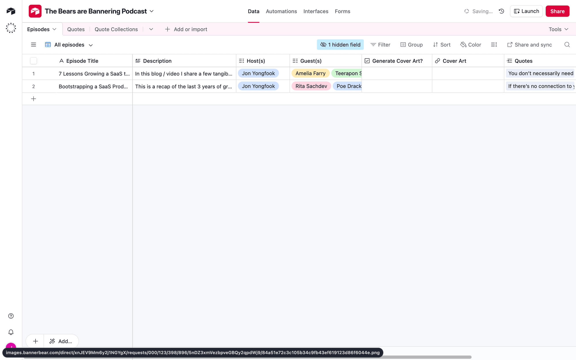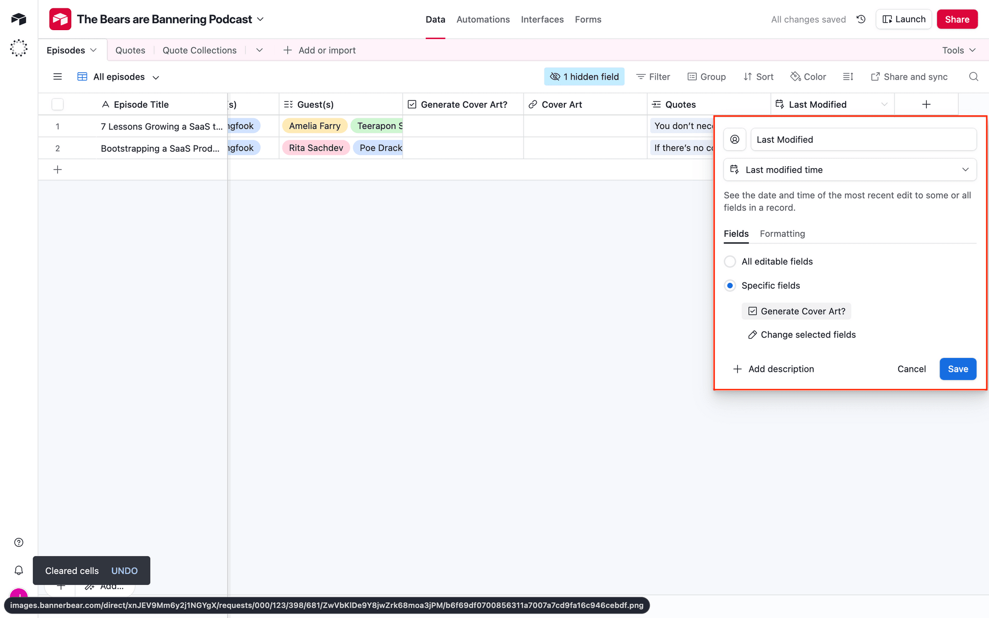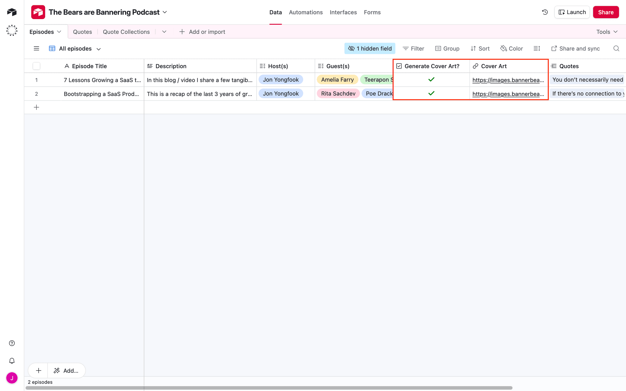 Now, whenever you click a checkbox on your Airtable base, cover art should automatically be generated and stored on your table, ready for episode release!