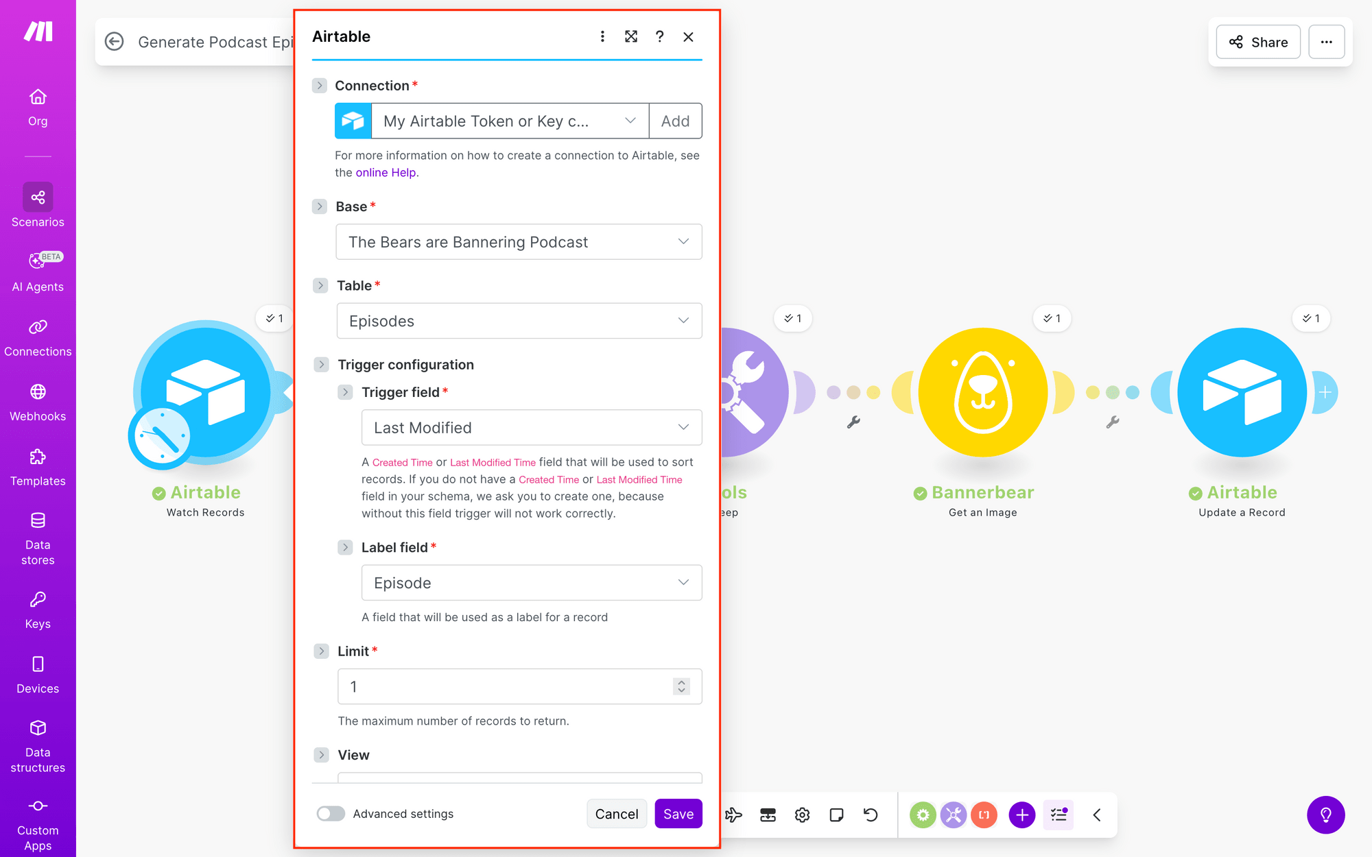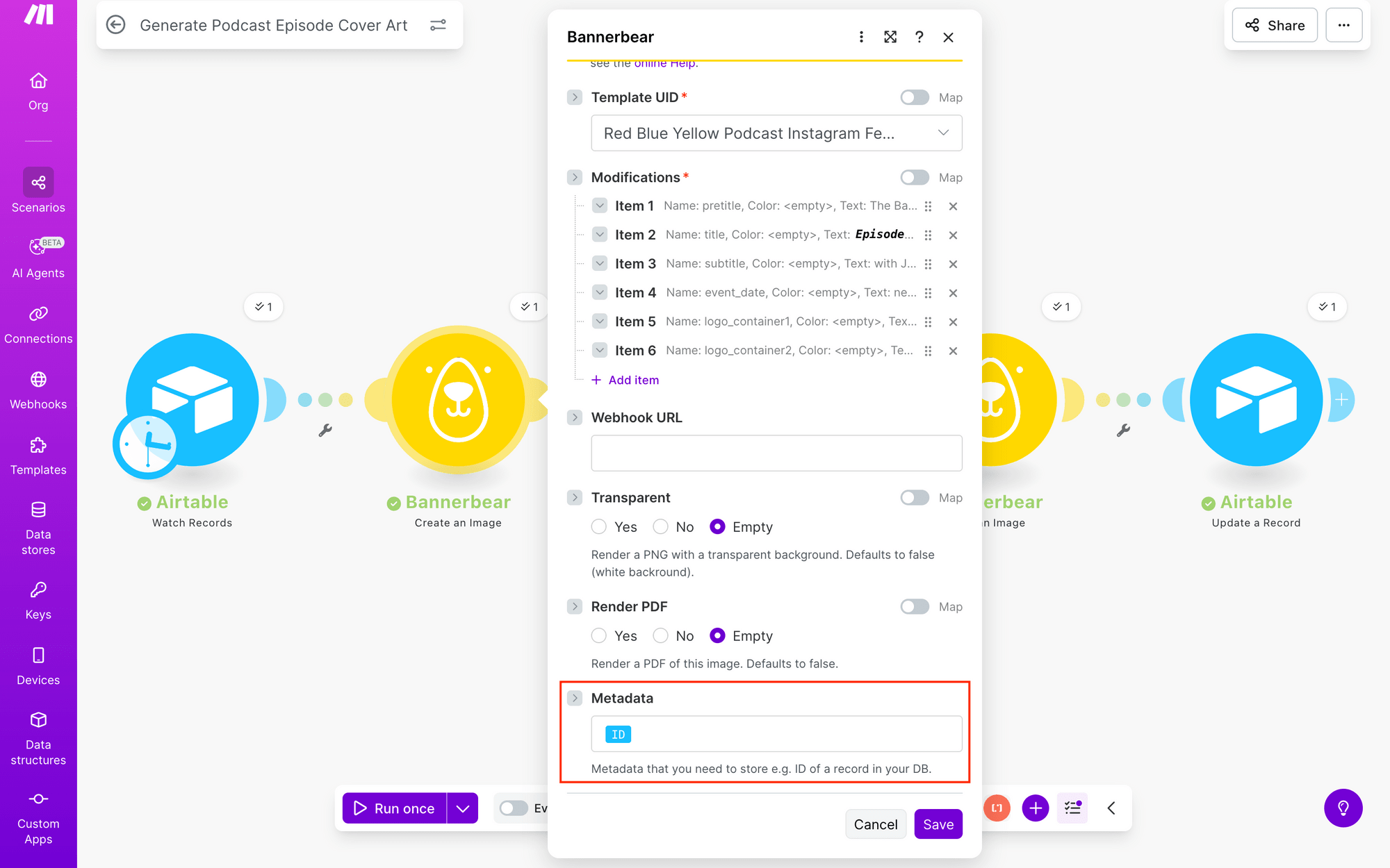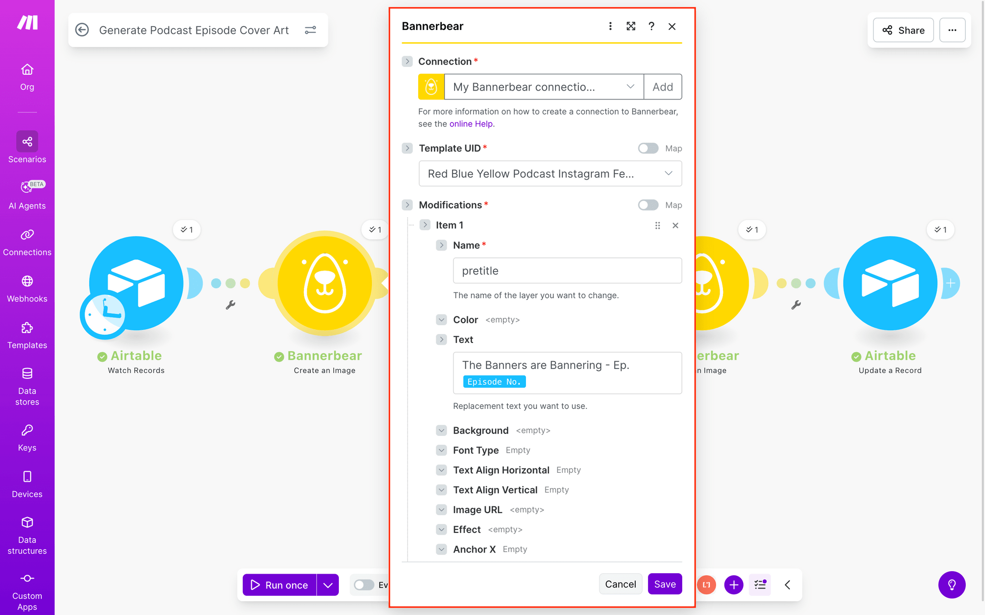 Now that there’s a clear look at our end destination, let’s walk you through setting up your automated cover art system from start to finish. You'll design a flexible Bannerbear template that serves as your creative foundation, organize your episode data in Airtable, and connect everything through Make to create a seamless workflow.
