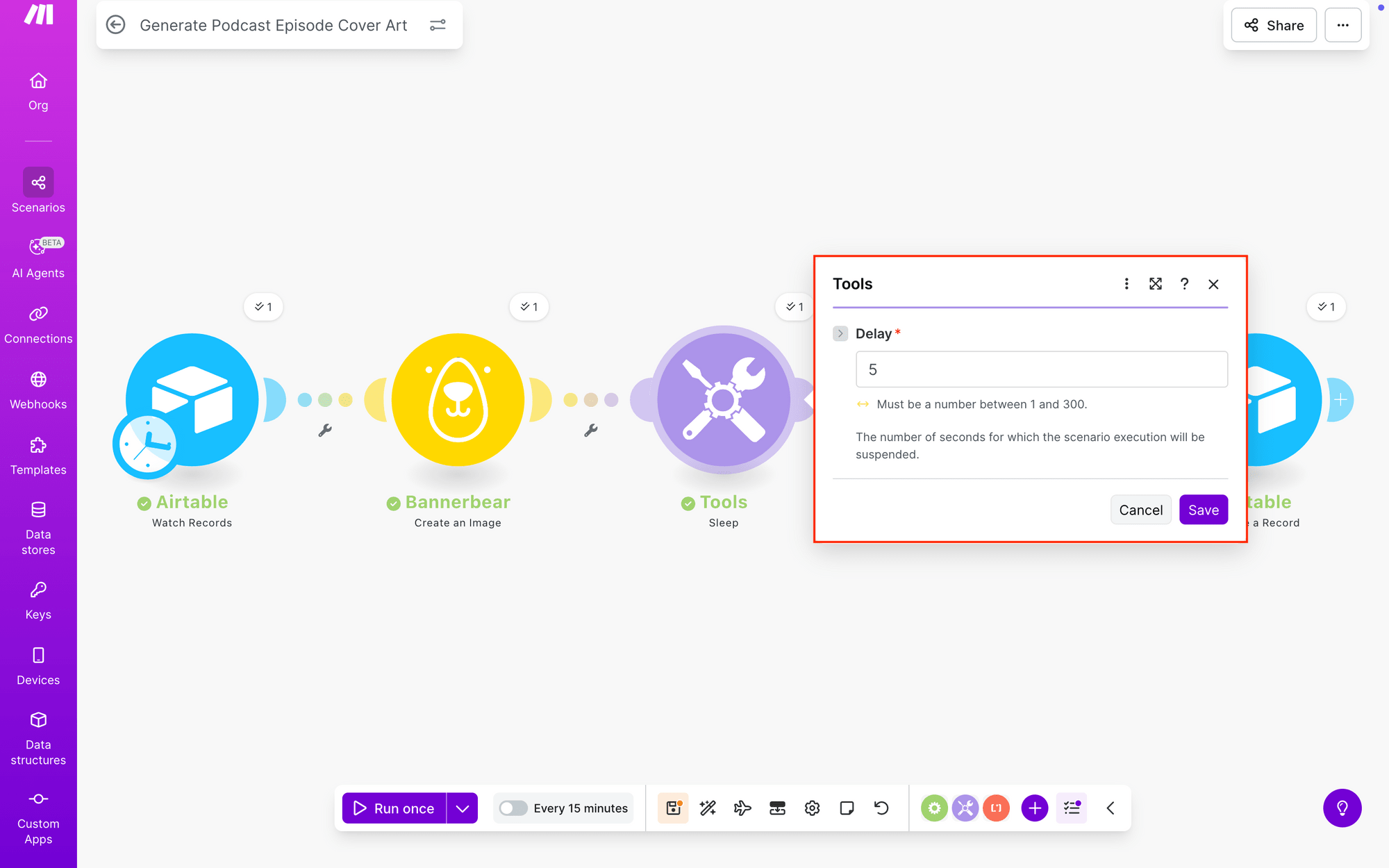 At this point, running the scenario will fetch episode data, then generate cover art. However, because Make’s response time is so quick, we are not always able to get an image URL instantaneously. Adding a short delay will help with this.