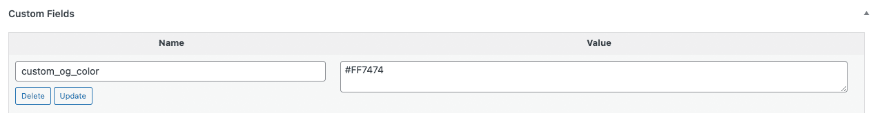 After enabling Custom Fields, go to your post’s text editor and add a custom field named “_custom_og_color”. S_et its value to the hex color code.