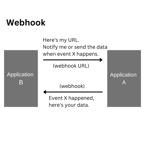 A webhook is a communication mechanism for one application (Application A) to automatically send a message or information to another application (Application B) in response to a specific event. The event could be the completion of a task, the submission of data, or even a scheduled trigger.