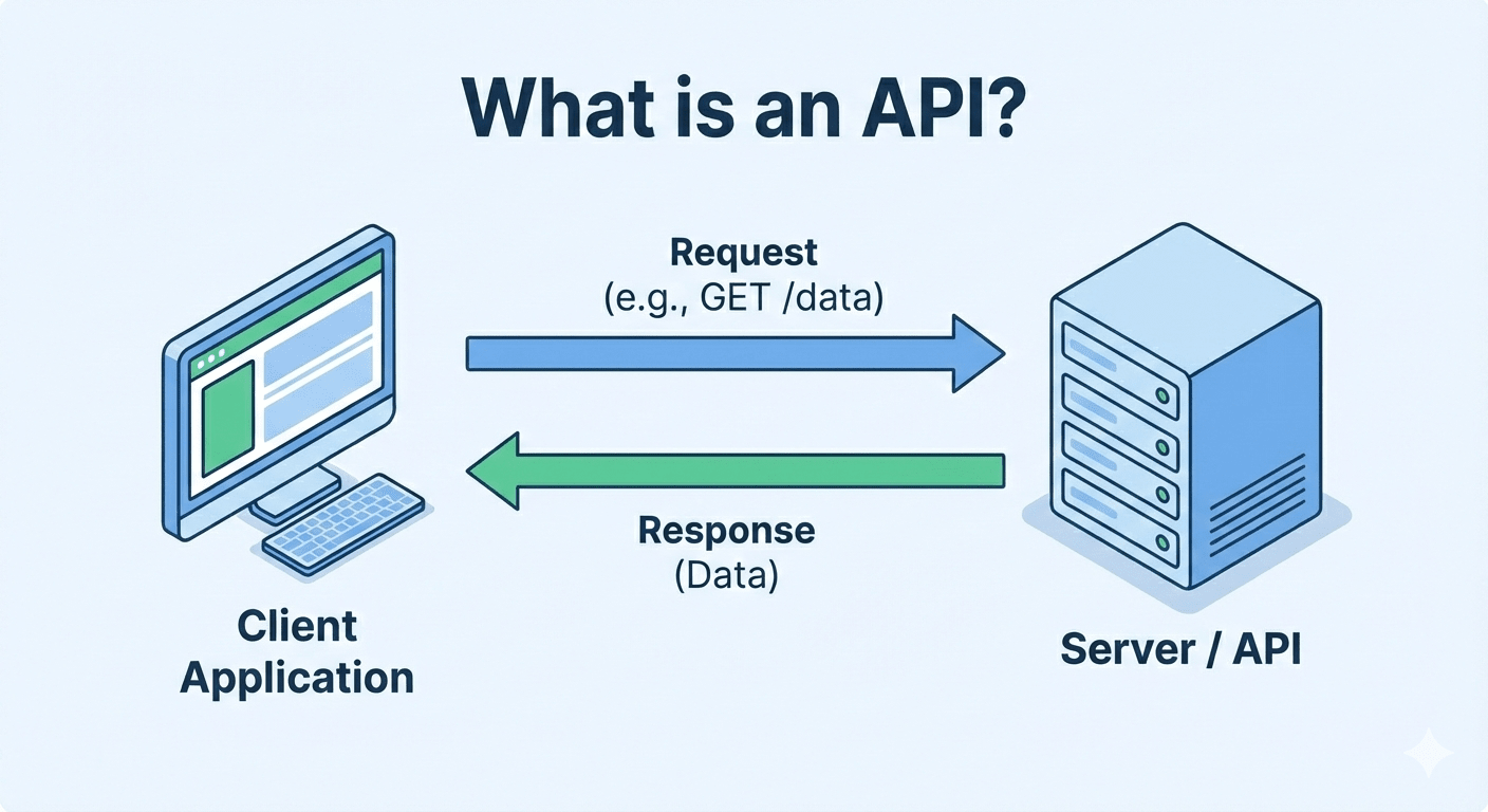 An API (Application Programming Interface) is a set of rules and protocols that allows one application to request data or actions from another operating system, application, or service. It enables different applications to talk to each other.